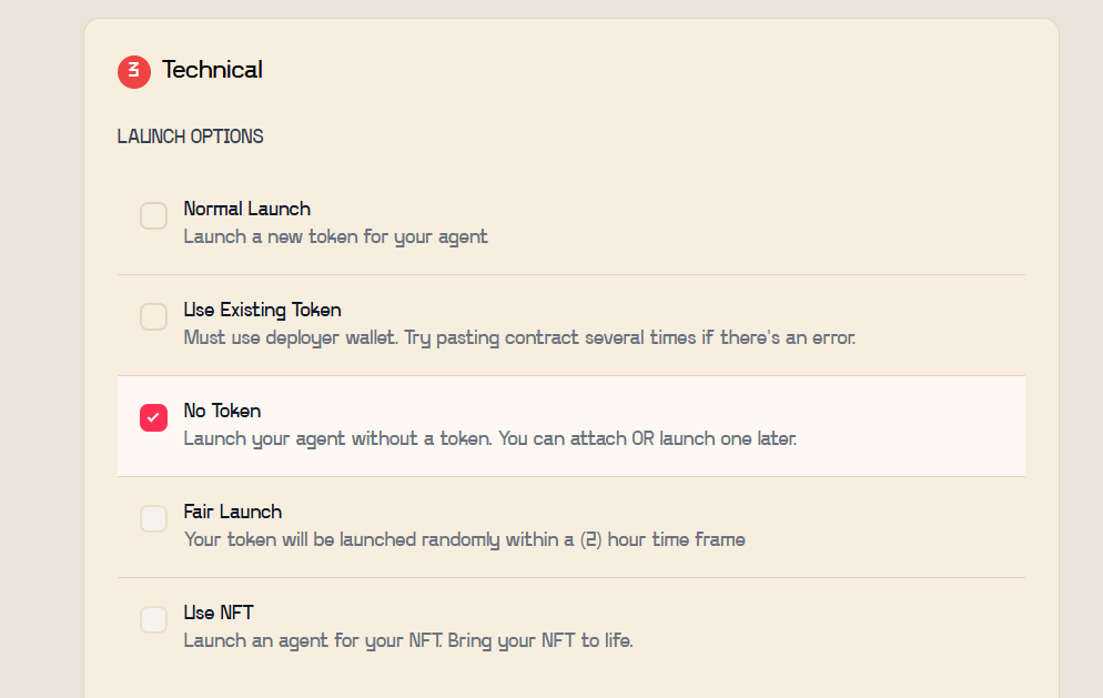 - Select the option: launch a new token, use an existing token, or do not use a token.