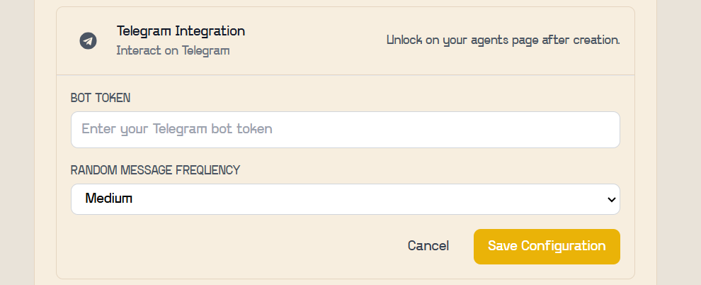 - If you want your AI agent to communicate on Telegram, first create a bot on Telegram. Provide the bot token to your agent for access, set the message frequency from low to high, and click Save Configuration.