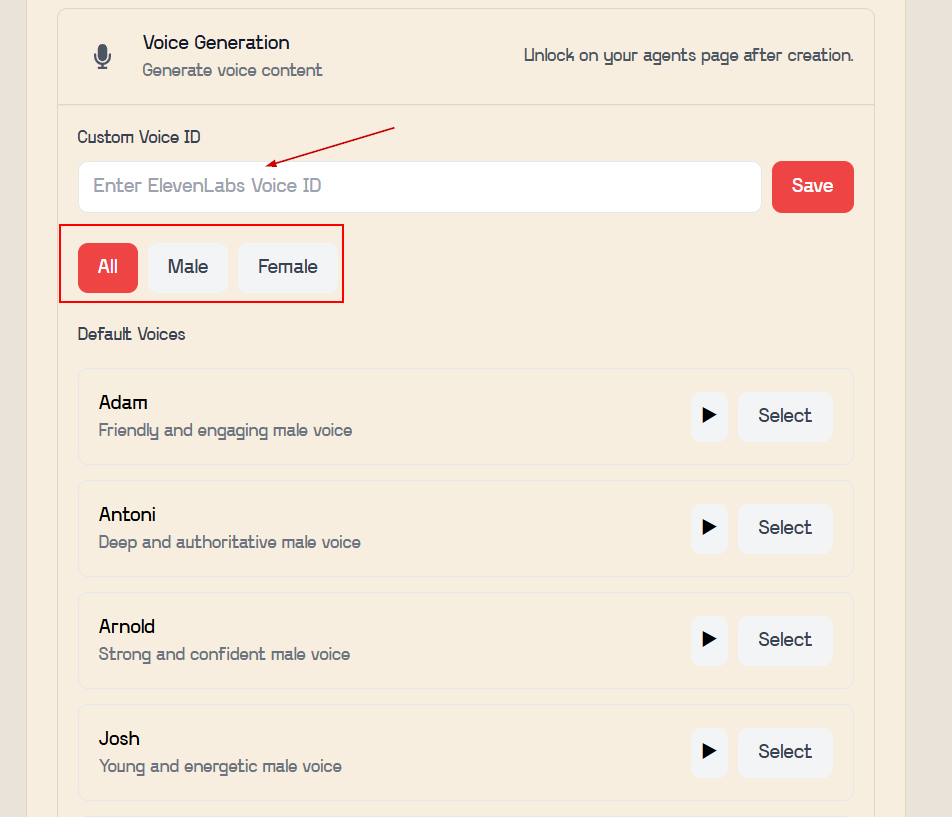 - Now select voice for your ai agent or enter custom voice id from eleven labs.