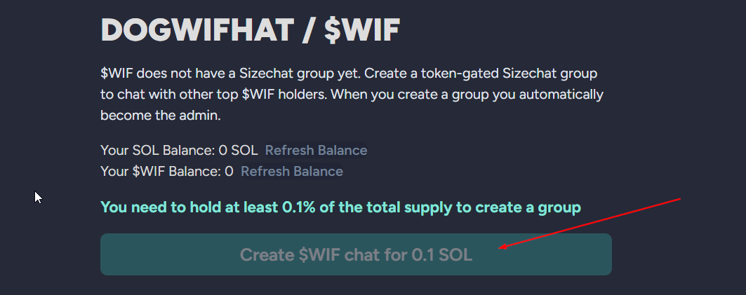 - If you're holding 0.1% suppply of your token and has 0.1 SOL in your connected, click Create $WIF chat for 0.1SOL.
