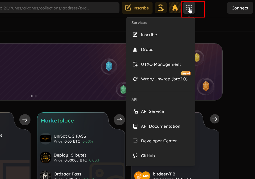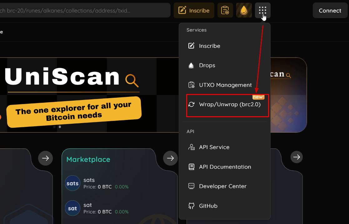 - Visit unisat website and place cursor on the following tab.