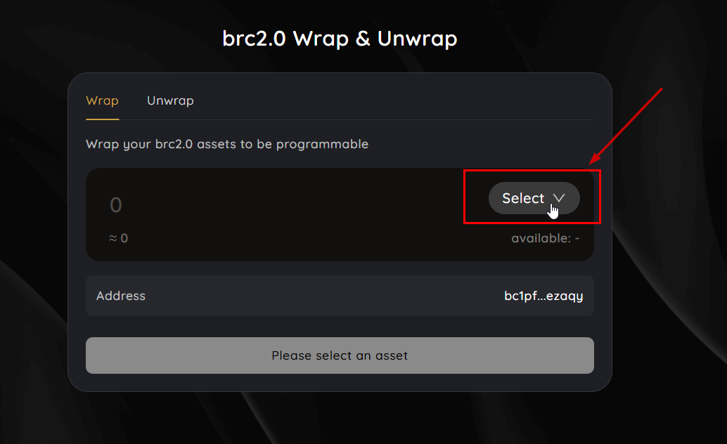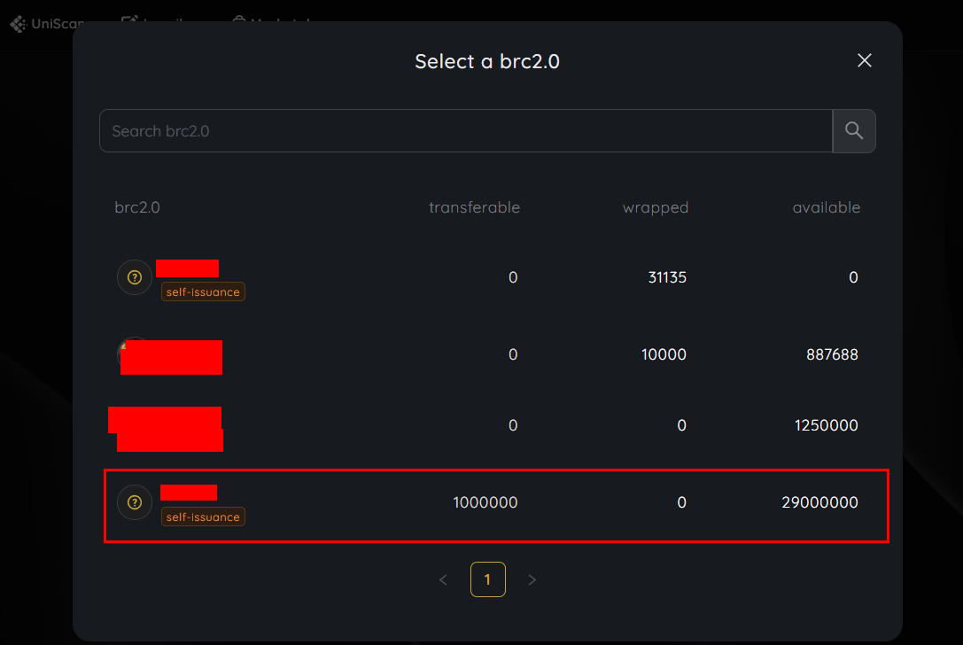 - Select the brc2.0 token which you want to wrap up. Make sure your balance is transferable already.